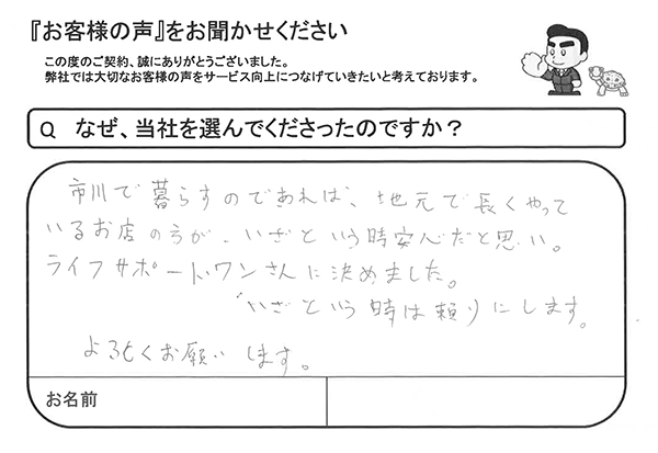 近所ということもあり、道で会った時も声をかけて下さり、世間話もできる保険屋さんはそうないと思いますので、この信頼関係を保っていけたら…と思っています。引き続きよろしくお願いします。これからも頑張って下さいね。